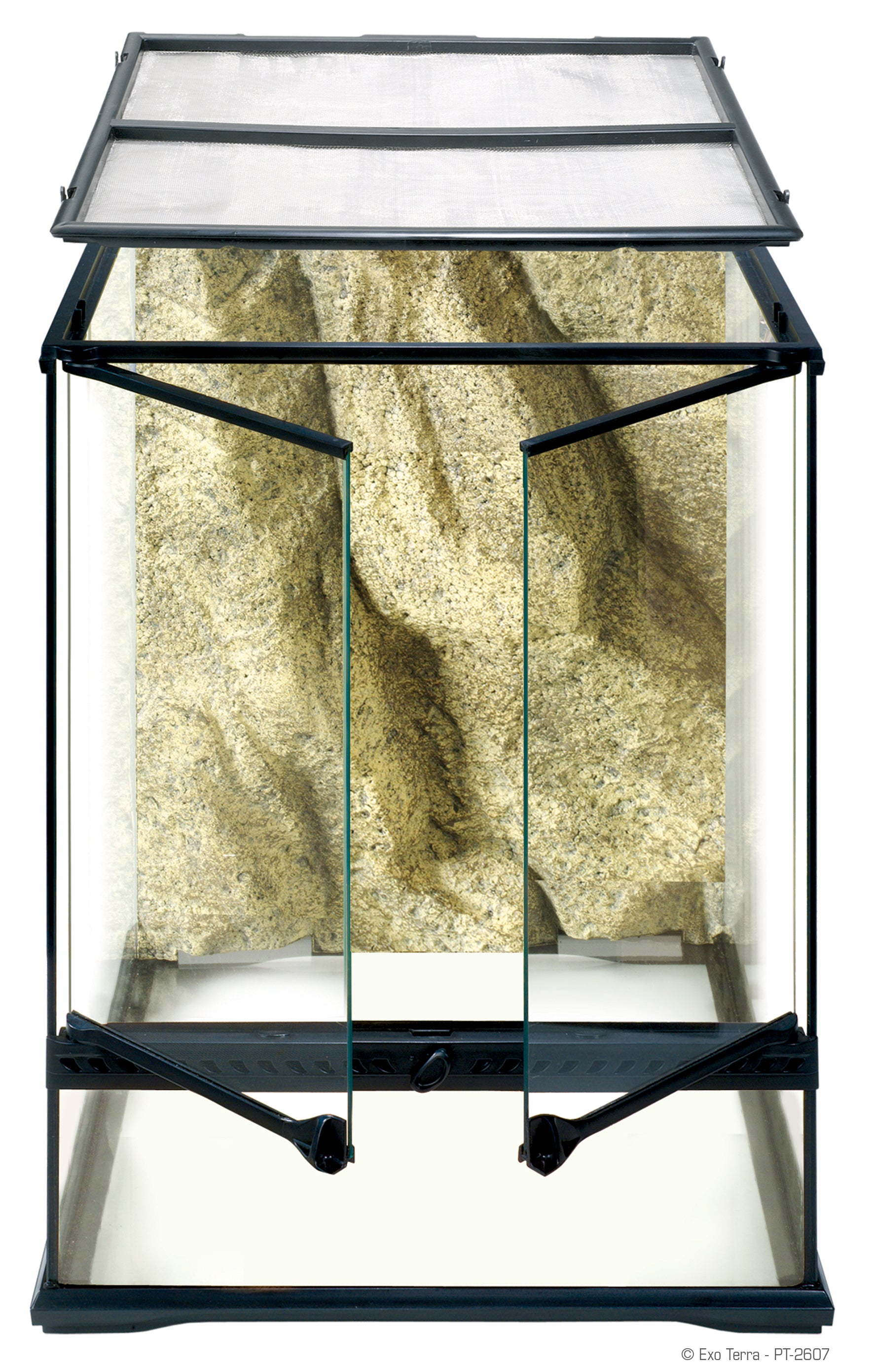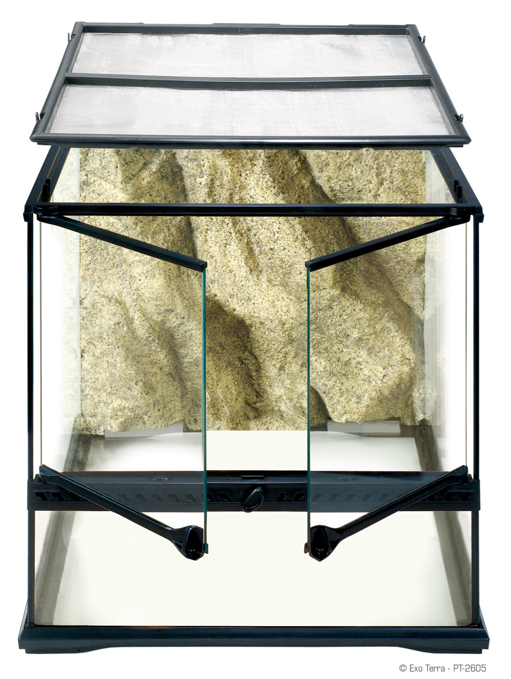 The Exo Terra Glass Terrarium is the ideal reptile or amphibian housing designed by European herpetologists. The front opening doors allow easy access for maintenance and feeding. A specially designed lock will prevent escape and the doors can be opened separately. The full screen top ventilation allows UVB and infrared penetration and is completely removable for easy access while decorating or cleaning. In the back of the screen cover are 5 closable wire or tube inlets on both sides to install Heat Wave Rocks, Waterfalls, sensors, etc. inside the terrarium. The bottom plate of the terrarium is raised to mount a substrate heater to heat a part of the extended ground surface. The extra high fixed front window is ideal for thick layers of substrates (burrowing reptiles), aquatic parts (paludarium) or to mount an Exo Terra reptile den. The natural background is in the same colour like all other Exo Terra decoration items (Water Dishes, Waterfalls, Heat Wave Rocks, etc.) and provides an extra climbing dimension.