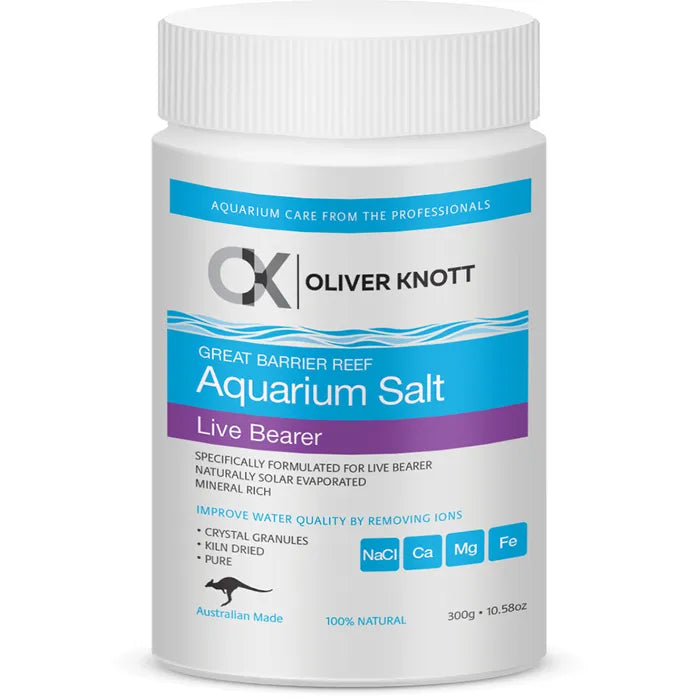 Oliver Knott Live Bearer Aquarium Salt contains essential electrolytes and is mineral rich in calcium, magnesium and iron which can help improve water quality by removing ions and replacing lost trace elements during water changes.