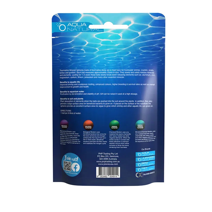 Tourmaline Mineral Spheres made of tourmaline stone are a must have for freshwater shrimp, crayfish, snails, bettas and goldfish. Each ball measures approximately 25mm in size. They slowly and safely release minerals and elements. Lasting for 1–2 years these balls slowly break down releasing elements such as: aluminum, iron, magnesium, sodium, lithium, potassium and many other essential minerals.